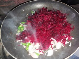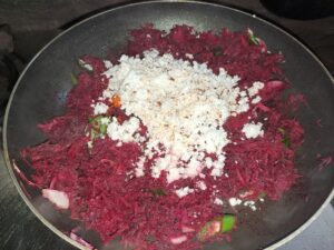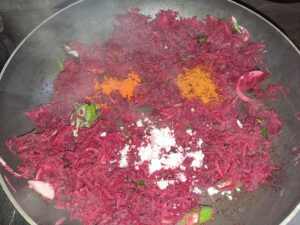 This Beetroot and Black Chickpeas Stir Fry is a powerhouse of nutrition. Beetroot is rich in iron, antioxidants, and fiber, while black chickpeas are a great source of plant protein. Together, they create a protein-packed vegetarian side dish that supports heart health, boosts energy, and keeps you full longer. The dish is stir-fried in a traditional Kerala way, enhancing its natural flavor with aromatic coconut, curry leaves, and gentle spices.