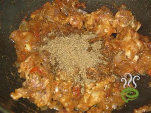• Now add grind powder and sauté for 5 minutes and add water and cook till chicken cooked