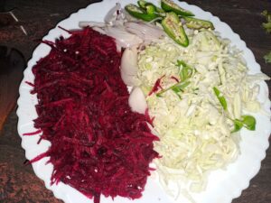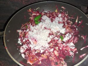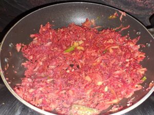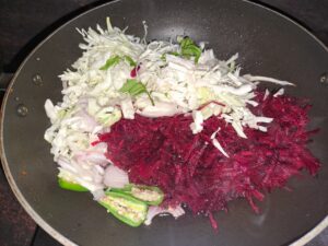 In Kerala homes, “Thoran” means a dry vegetable dish cooked with coconut. The mix of cabbage and beetroot not only enhances visual appeal but also adds multiple health benefits. Beetroot is rich in iron and antioxidants, while cabbage provides fibre, vitamins, and digestive goodness. Together, they create a wholesome stir fry that pairs beautifully with steamed rice, sambar, or rasam.
