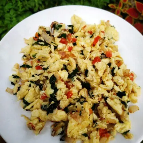 Mexican Scrambled Eggs with Chaya requires just a few basic ingredients provided Chaya leaves are available. A few tips for preparing scrambled eggs. Medium to low heat has always been my success while preparing scrambled eggs. Too much heat dries up the egg mixture. It should be creamier and sort of melting texture. That does the trick and makes Mexican Scrambled Eggs with Chaya even more tastier and fluffier too. Chaya leaves are a great source of calcium, magnesium, iron, proteins, and antioxidants. Since it has a certain amount of toxicity when eaten raw, it is preferred to consume cooked. These well balanced super foods are the best for any part of the day. You can explore a well detailed Mexican Scrambled Eggs with Chaya recipe here.