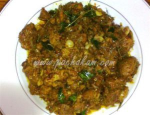 Keep aside for ½ and hour.4) Cook the mutton in a pressure cooker with little water and make it dry.5) In a kadai, heat 2 tbsp oil. Add the freshly crushed garam masala, shallots, green chillies and curry leaves.