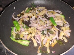 Kerala cuisine is known for its clean flavors and minimalistic spice blends. Pavakka Upperi reflects this philosophy beautifully. Thinly sliced bitter gourd is sautéed slowly to achieve a crisp texture while retaining its earthy taste. The use of coconut oil enhances the authenticity, giving the dish its signature Kerala aroma.