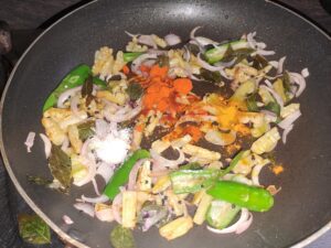 The key lies in slicing the pavakka evenly and cooking it patiently to achieve that golden, lightly crisp finish. The result is a dry stir-fry that is both rustic and comforting.