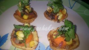and potatoes into thin round shape. Chop onions & coriander leaves. Boil corn and set aside.