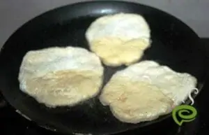 • Put a pan or a roti chatty on moderate fire and add coconut oil and spread the oil all over the pan and put those round shape raw roti in the pan.