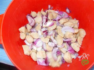 • Heat 1tsp of oil in a microwave vessel and add cooked soya nuggets and onion to this and micro wave for 2 minutes.