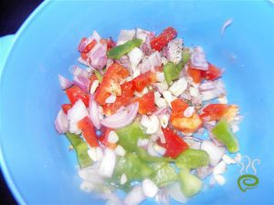 • In a oven proof bowl add oil , then add onion,tomatoes capsicm and oreganoes micro wave for 2 minutes.