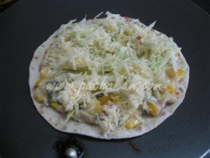 Place a tortilla on a skillet/cast iron griddle on medium heat. Layer the sweet corn, shredded cabbage and some cheese onto the tortilla.