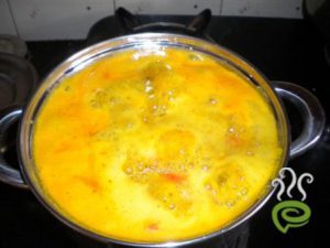 • Add the red chilli powder, turmeric powder and salt into the boiled toor dal and tomato and boil it further.
