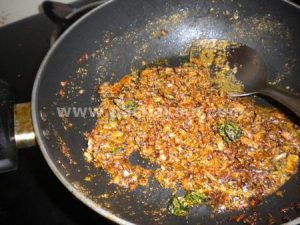 Mix the coriander and chilly powder with the fried mustard, onion and curry leaves.
