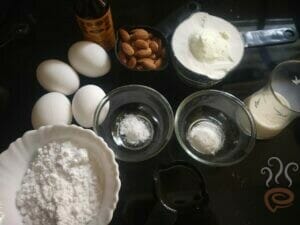 Combine all the dry ingredients: all purpose flour, finely crushed 1/2 cup almond, baking powder, baking soda, salt and milk powder. Sift all these dry ingredients in a bowl and keep it ready.