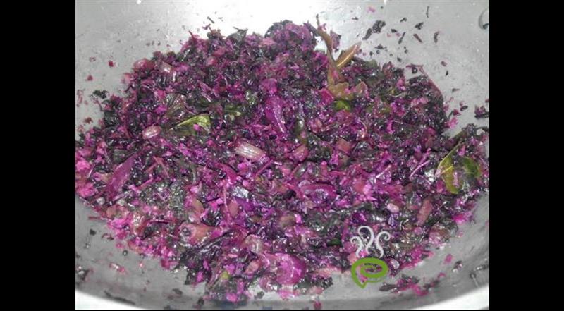 Add cumin, garlic cloves, black gram, curry leaves and red chillies and pour the cooked amaranth curry in this seasoning pan.