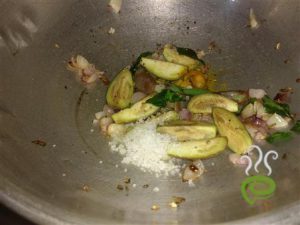 Now ad chopped shallots ands brinjal and saute well and add turmeic and salt
