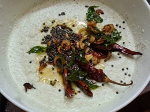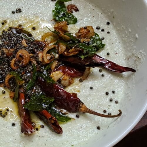 Heat oil in a tadka pan over medium heat. Add mustard seeds and allow them to pop. Then add dried red chilly, chopped shallots and curry leaves. When the shallots turn light brown in colour, turn off the flame and pour the tadka over the chutney and stir in.