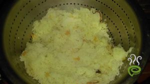 Add mutton masala on top of the rice and top the layer with rice(The top layer should be of rice)cover the bamboo logs top with an empty coconut shell.heat a pressure cooker/puttu kudam with 3 cups of water and bring it to boil.place the bamboo log on top of it and steam cook for 5-7 minutes.