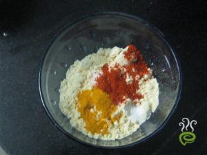 In a bowl take besan flour , red chili powder, turmeric, salt mix ti.
