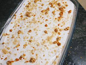 Beat the whipping cream by adding 1/2 cup powdered sugar until stiff peaks form. Pour it over the first layer of bread. Meanwhile, take the caramel cashew and crush it. Garnish the pudding with that. Yummy delicious Butterscotch Pudding is ready.