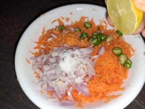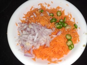 Finely chop onion and green chilly, add it into grated carrot.