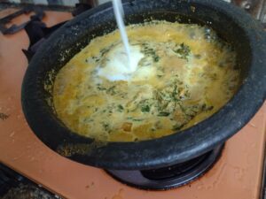 After about 5 minutes add the butter milk into cooked Cheera. Mix and stir it well and after 2 – 3 minutes put off the stove. Do not boil. Remove pan from flame.