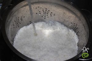 Fry the rice in little oil for around 5 mts. This way rice wont stick each other. Pour water around 5 cups and add some salt (water should be little salty). Cook the rice until it is 99% cooked.Drain the rice in a colander and run some cold water and keep it aside to drain completely. The cold water will stop the cooking of rice further.