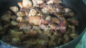Heat oil in a pan and fry the chicken till its brown in colour.