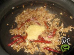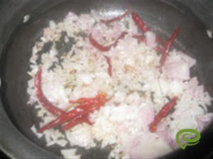 In another pan, heat oil and add whole jeera, finely chopped onions and 8 - 10spicy chillies and fry till the onions start to turn slightly brown.