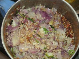 In pan add oil and roughly chopped onions and ginger , garlic ,g.chili,coriander saute well and add grated coconut at last and allow to cool