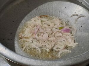 Heat oil in a pan, add mustard seeds, let it splutter, then add onions. Saute till transparent and add required salt.