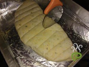Now fold like semi circle and cut slight whole dough with 1 inch gap( refer pic) . place in tray with greasing