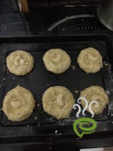 In a baking tray, apply the butter and dust with maida. Place the small balls of mixture in the plate as shown in the picture