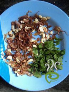 For biriyani rice take some mint leaves,fried onion,cashew nuts and raisins