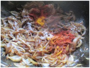 * Cut onion in length wise. Heat oil in a pan add chopped onion and stir till it turn golden colour. Add chilli powder, turmeric powder, salt, garam masala powder and stir well.