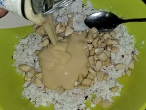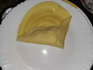 When it is cooked on one side, place a spoon of coconut filling on one end of the pancake and roll it.