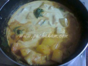 Mix the grinded coconut and shallots with the boiling curry once the ash gourd gets