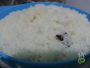 Half boil the rice with required water, salt, cardamom, cloves and cinnamon for flavouring the rice. Strain the rice and keep it aside.