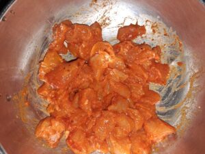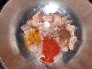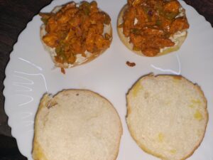 Spread some mayonnaise on one side of the bun like shown in the image and add cooked chicken on top and cover with the bun piece.