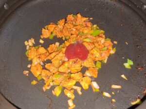 Then add chopped onion and capsicum. Saute for 2 minutes.