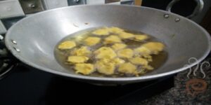 Heat oil in a Cheenachatti and dip the Kadachakka pieces in the Paste (already prepared and kept aside) and put them into the hot oil, stir it occasionally and cook the pieces properly in medium flame.