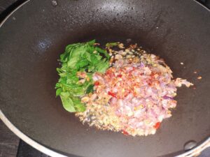 Heat oil in a pan and add curry leaves, crushed shallots and chilli flakes.