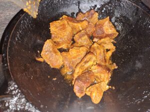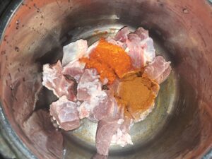Cook the beef by adding red chilly powder, turmeric powder and salt as required.