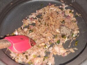 Heat oil in a pan and saute onion and green chilly and add salt as required. Saute till the onion becomes golden brown in colour.