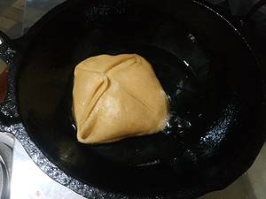 Deep fry each kannu pathiri in hot oil, Remember to keep the folded (kannu side) on top. Gently press on it as it will help to puff up. Then slowly flip to the other side and when it is light golden brown remove it to a paper napkin and fry the rest.