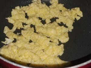 Heat ghee in a pan. Beat the eggs with sugar and pour it into the pan.