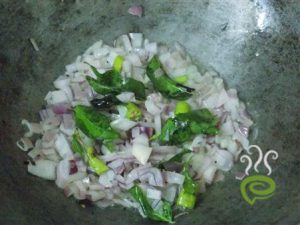 Heat oil in the kadai and temper the mustard seeds and curry leaves. Saute onion and green chilli.