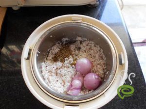 in a blender add small onion, coconut and cumin seed and make a fine paste