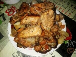Now take a pan and arrange the marinated chicken in it. Then arrange the cut veggies on top of the chicken pieces.