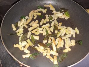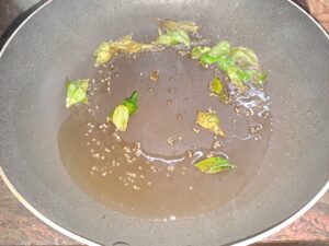 Heat oil in a pan. Splutter mustard seeds and add curry leaves.