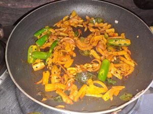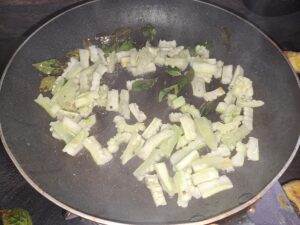 Sauté for 7-8 minutes over medium flame, stirring occasionally until the bitter-gourd is completely done and slightly browned.