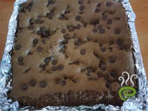 Now grease pan and pour mixture and top chocolate chips and bake in pre heated oven for 35 mins in 180 degree