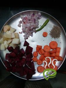 In a Pressure cooker add carrot, beetroot, potato, onion, green chilli , jeera, salt and add some water